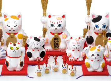追い出し猫は、表はほうきを持ってギョロリ、裏は手で招いてニッコリ。災いを退散させ幸福を招く、表裏一体型の招き猫です。怒った顔を前に置くのが基本。物語の発祥の寺である西福寺のゆかりの縁起物です。