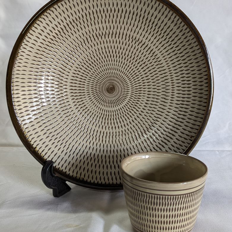 小石原焼は、刷毛目、飛び鉋、櫛描きなどによって表現される独特の幾何学的な紋様が特色で、素焼きを行わず釉薬を流し掛ける技法で作られます。日本の陶芸界に大きく影響を与えたバーナード・リーチによって、「用の美の極致である」と大きく称賛されました。